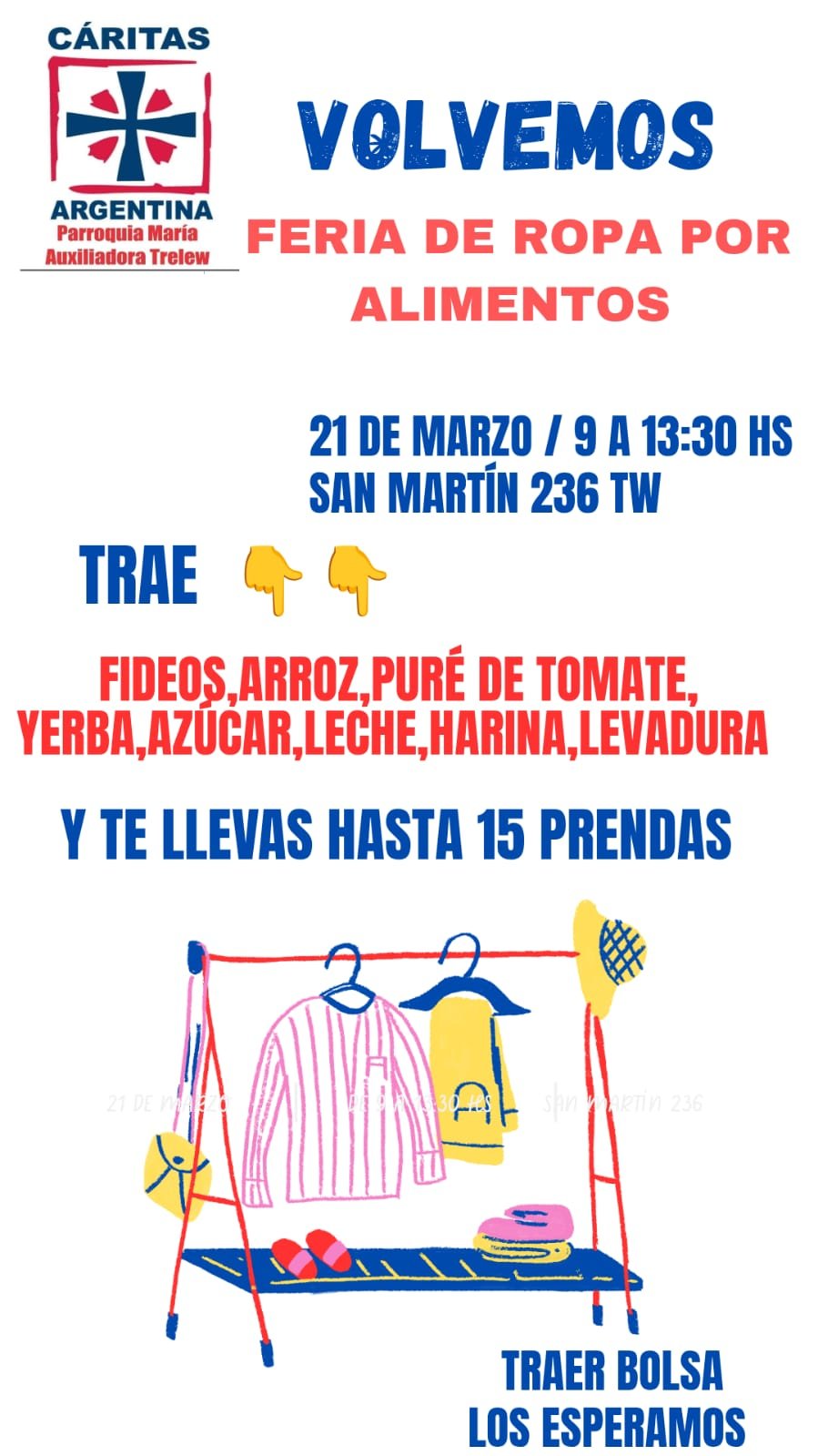 - Higiene y cuidado personal: bidones de agua, toallitas femeninas, toallas, jabón, cepillos y pasta dental, papel higiénico, pañales, barbijos, Platsul, vendas y colirio.