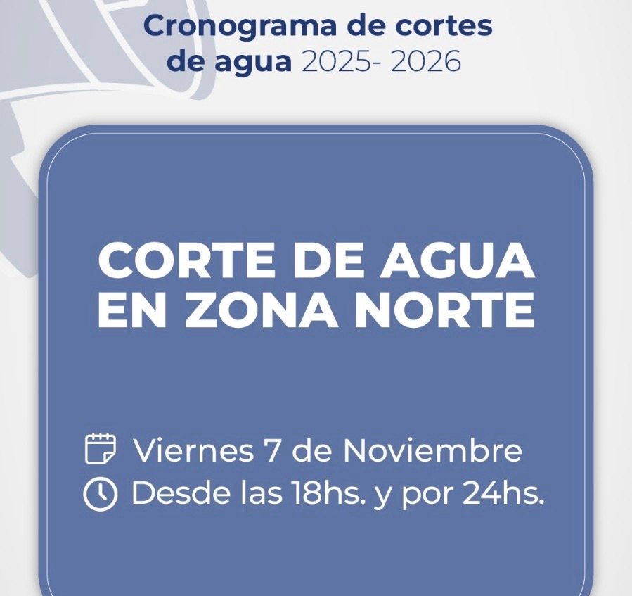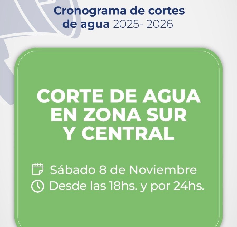 Hoy, viernes 7 de noviembre, desde las 18 y por un lapso de 24 horas, se interrumpe el suministro de agua en Zona Norte; y mañana, sábado 8 de noviembre, desde las 18 y por 24 horas, se interrumpe en Zona Sur y Central, para recuperar las reservas de Puesto La Mata.