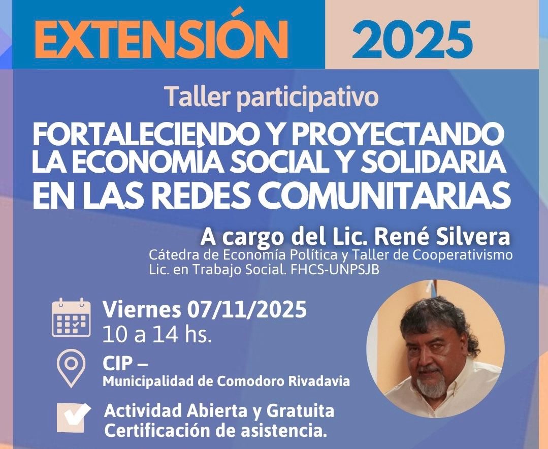 Con la organización de la Municipalidad, a través de la Dirección de Políticas para el Desarrollo de la Economía Social y Proyectos Especiales, dependiente de la Secretaría de Gobierno, y en conjunto con la Secretaría de Extensión de la Facultad de Humanidades y Ciencias Sociales de la Universidad Nacional de la Patagonia San Juan Bosco (UNPSJB), se llevará adelante el taller participativo “Fortaleciendo y proyectando la economía social y solidaria en las redes comunitarias”, cargo del licenciado en Trabajo Social, René Silvera.