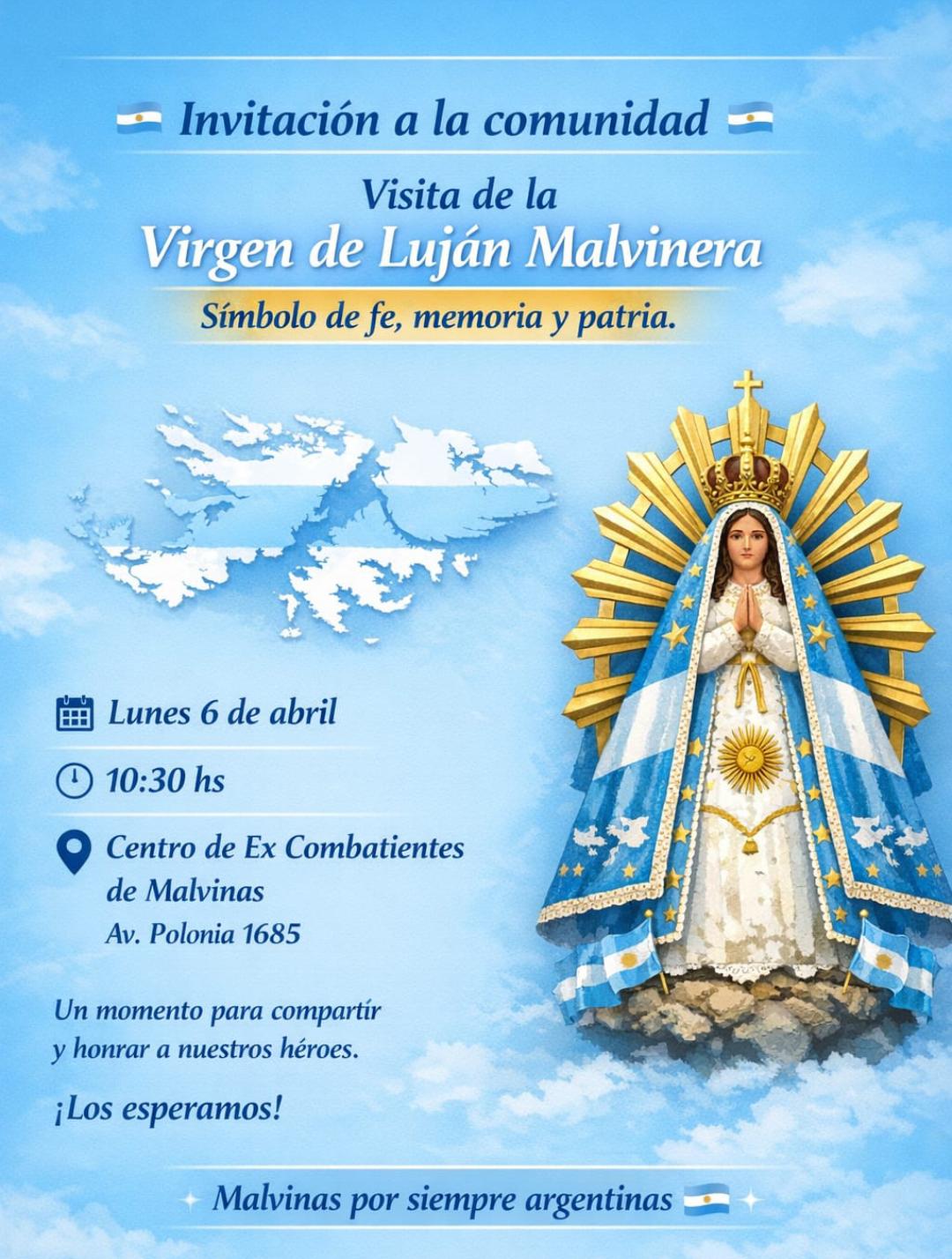 “Es un día importante para nosotros que nuestra Virgen de Luján, que estuvo con nosotros en Malvinas, venga a visitar nuestra casa y esté en la puerta del centro abierta a la comunidad”, expresó.
