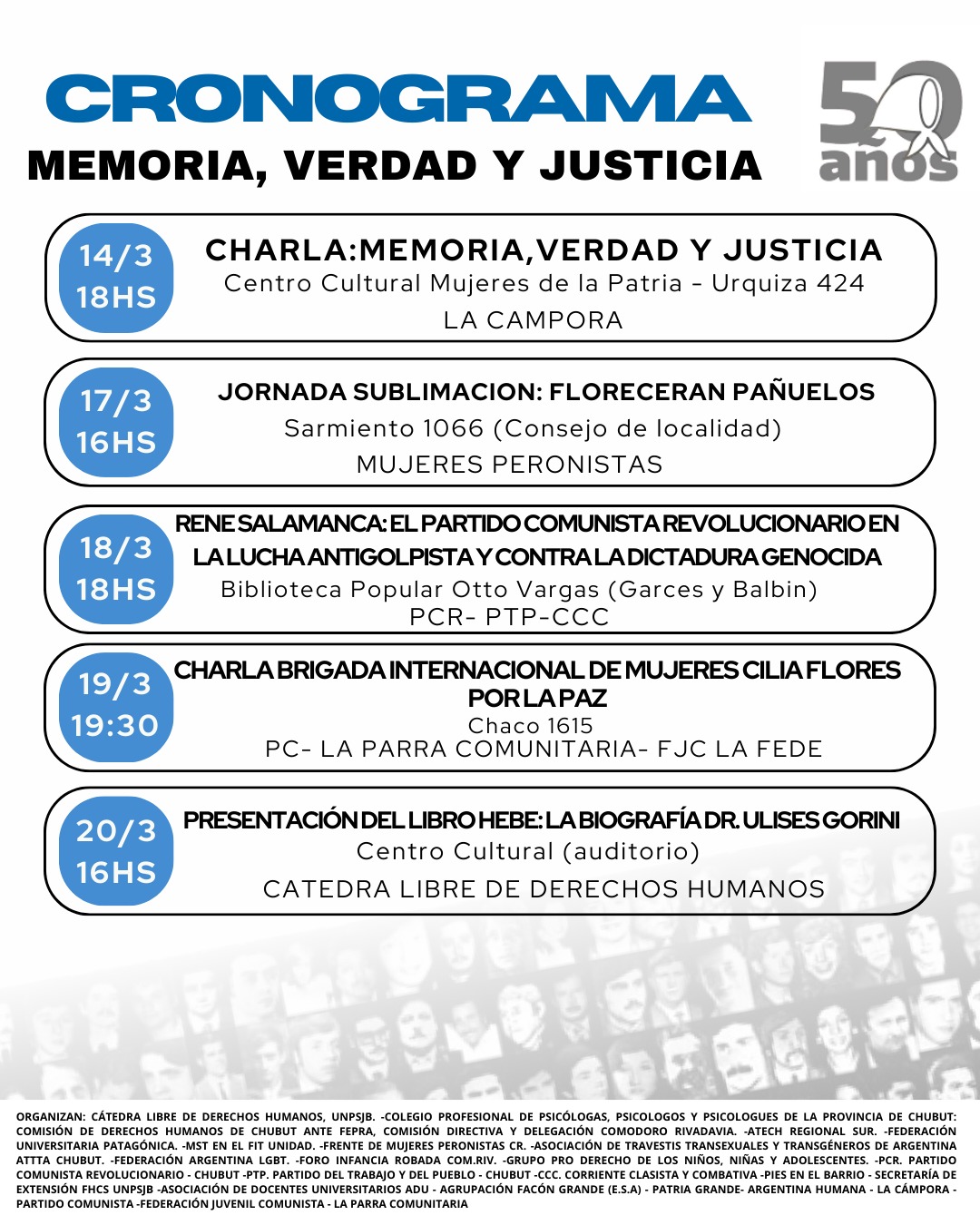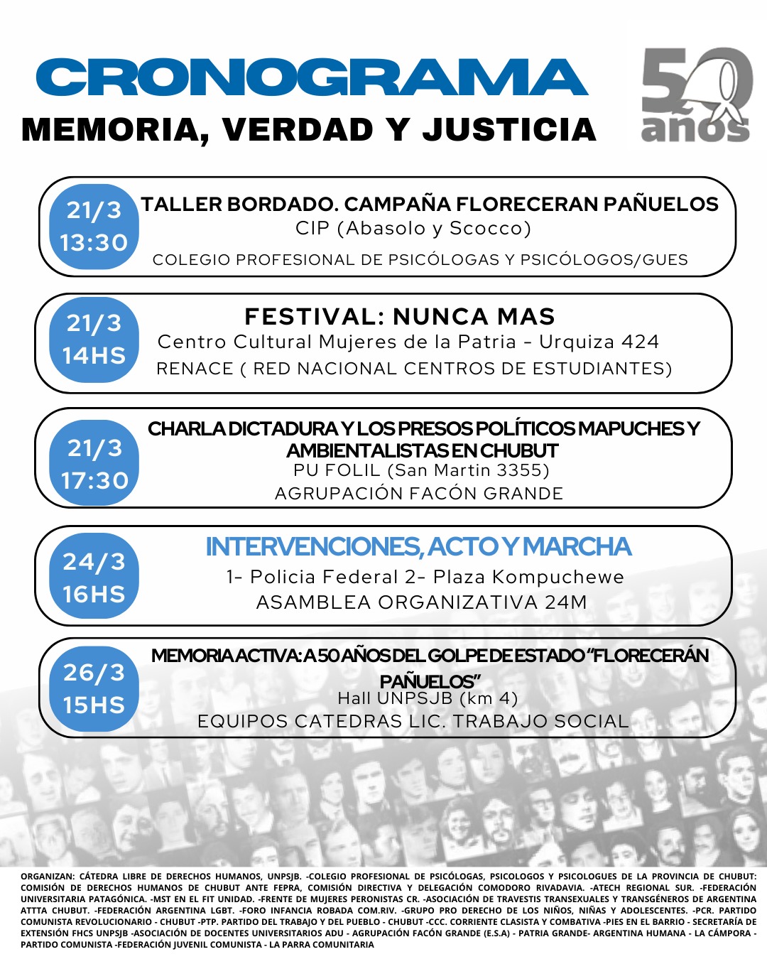 La propuesta se enmarca en la consigna “50 años, 50 acciones”, una iniciativa que surgió de organismos históricos de derechos humanos como Madres de Plaza de Mayo, Abuelas de Plaza de Mayo y otros colectivos de familiares de detenidos desaparecidos, y que se replicó en todo el país.