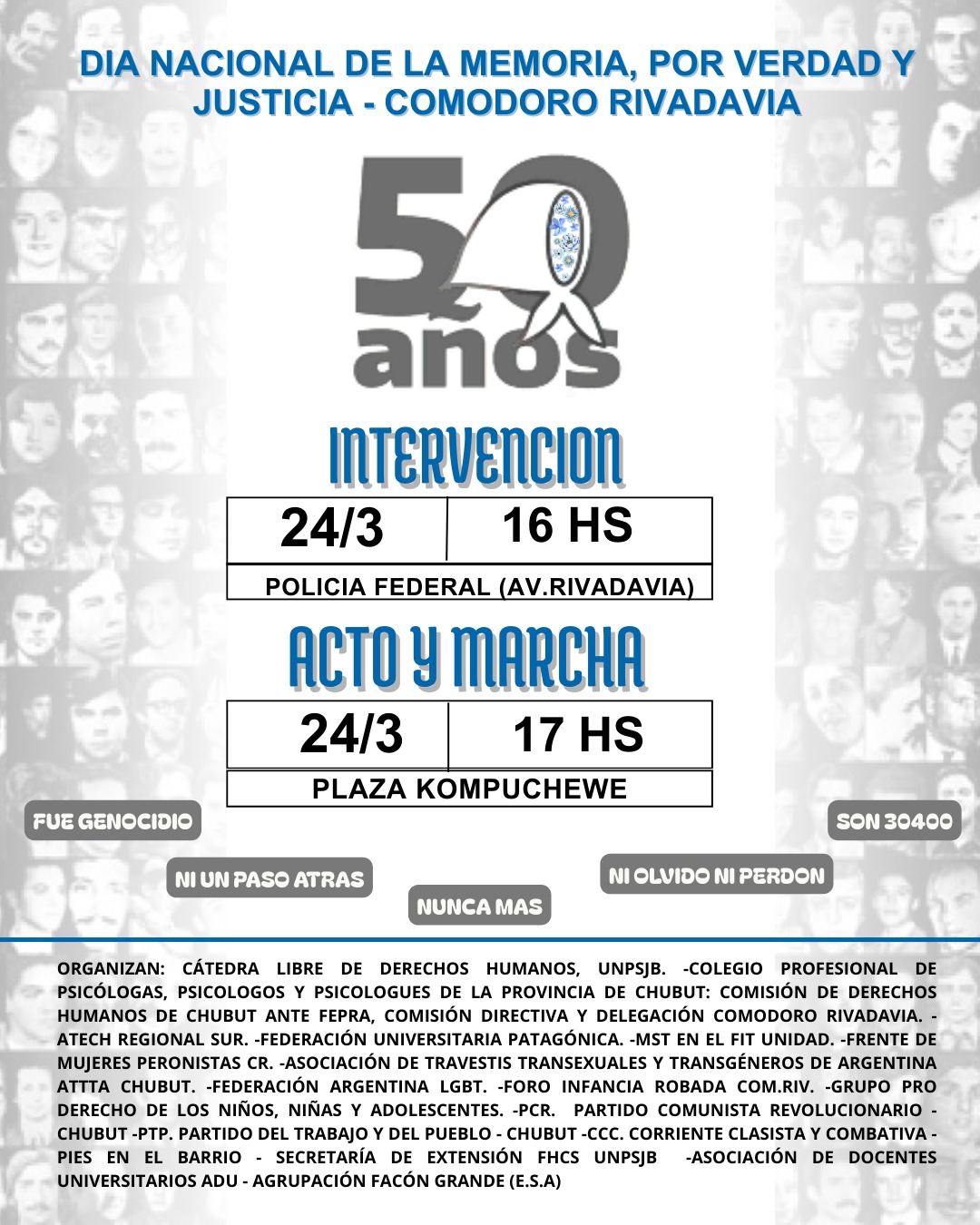 La iniciativa es impulsada por la Cátedra Libre y Abierta de Derechos Humanos de la Universidad Nacional de la Patagonia San Juan Bosco y reúne a cerca de 40 organizaciones de la ciudad, en un hecho que fue calificado como “inédito” por sus organizadores.