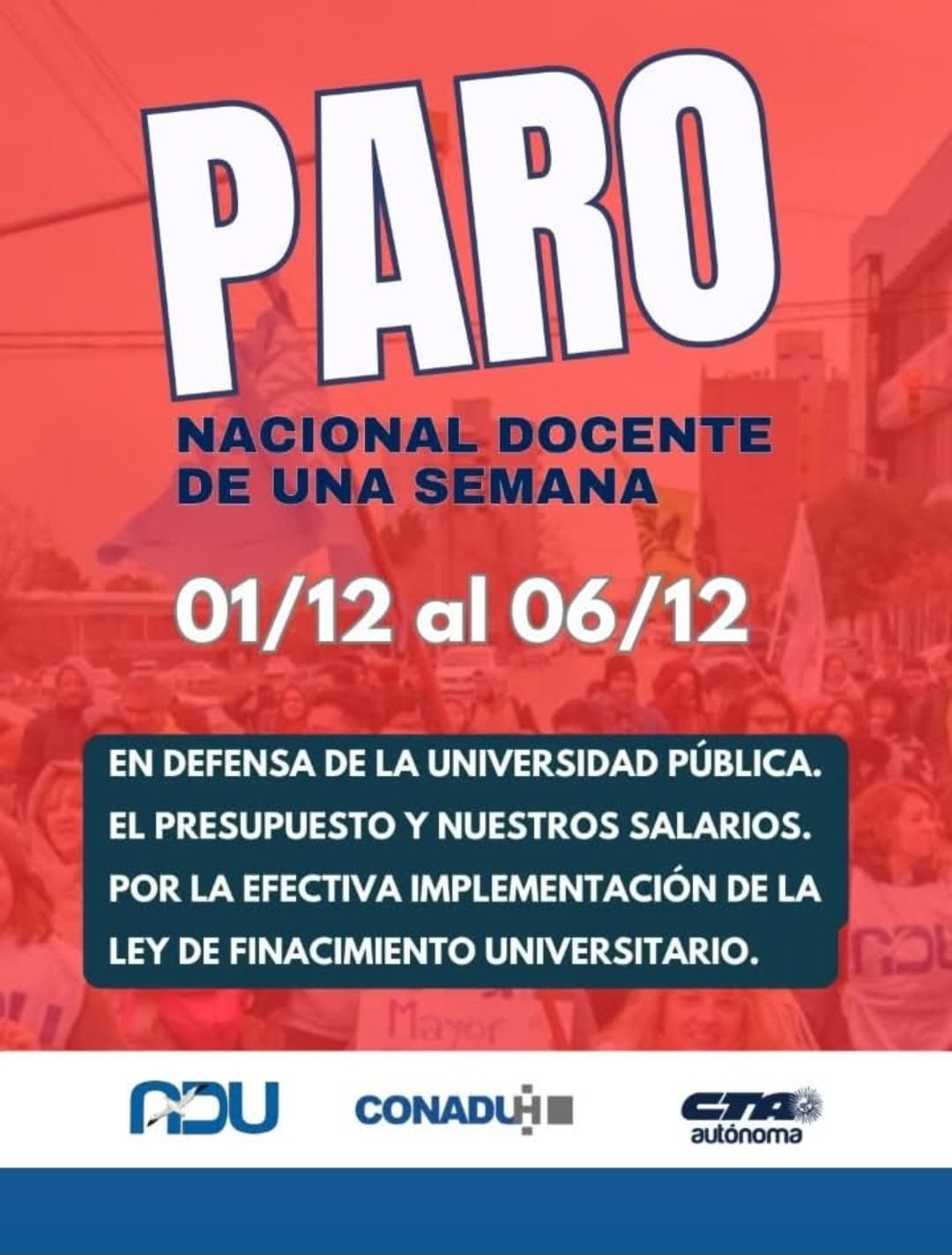 A su vez, aseveró: “En este caso, esta medida de paro es una medida nacional, todos los docentes adheridos en CONADU Histórica votaron esta medida, por lo que efectivamente va a ser una semana”.
