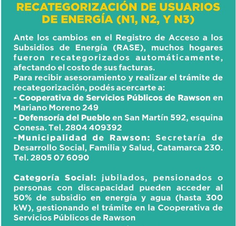Además, se recuerda que los jubilados, pensionados o personas con discapacidad pueden acceder a la Categoría Social, que otorga hasta un 50% de subsidio en energía y agua (hasta 300 kW).