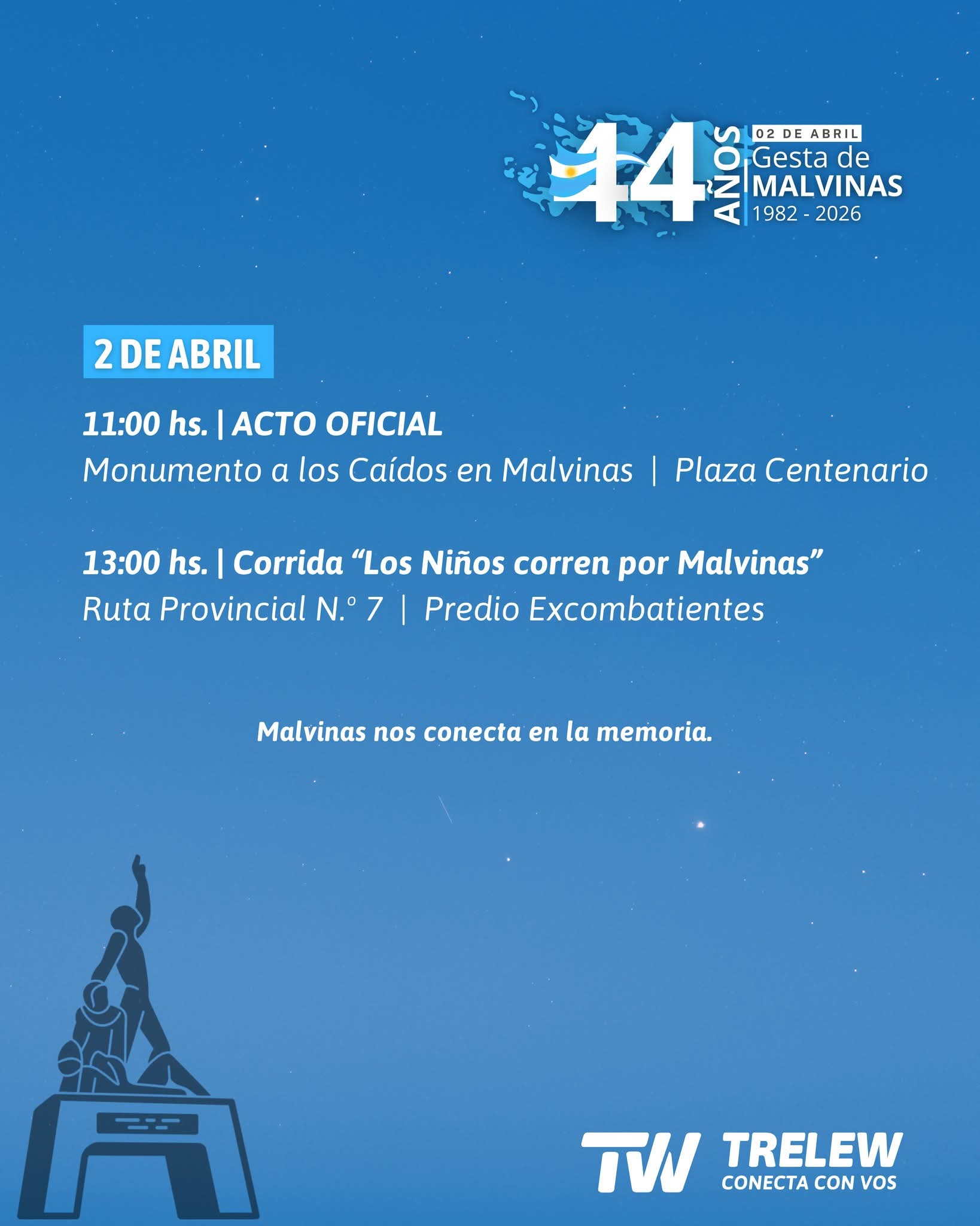 La Municipalidad de Trelew invita a la comunidad a participar de las actividades programadas por el 44° aniversario de la Gesta de Malvinas, que se desarrollarán este 1 y 2 de abril, que comprende la vigilia, el acto oficial y la corrida.